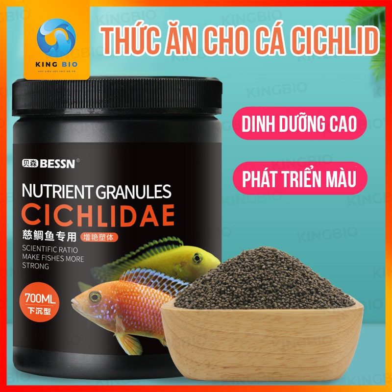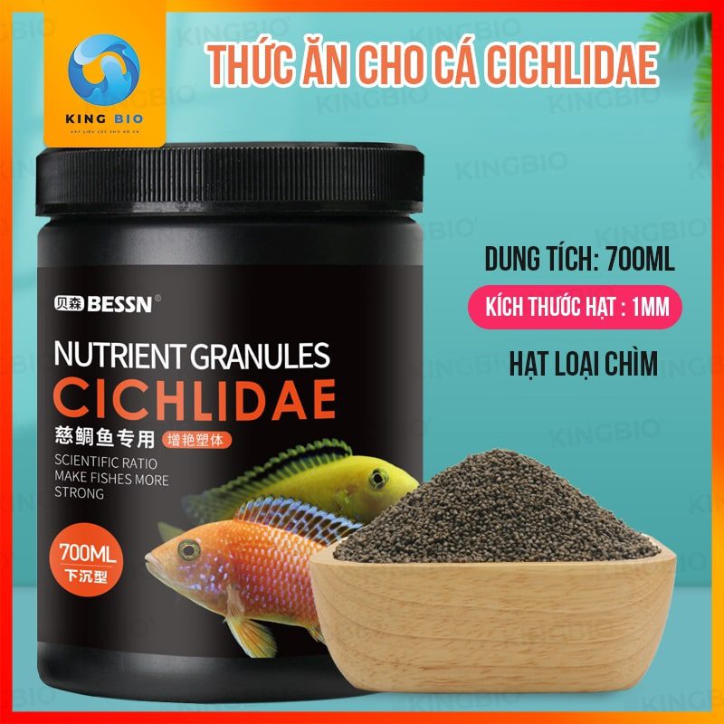 Cám Bessn Cichlidae (hộp 700ml hạt chìm 1mm) là loại thức ăn cân bằng dinh dưỡng cho cá Ali và các loại khác từ họ cá Cichlids đáp ứng đầy đủ các chất dinh dưỡng cần thiết cho sự phát triển của cá. Đặc biệt cám KHÔNG chứa Hormone, KHÔNG chứa các chất bảo quản đảm bảo an toàn khi sử dụng.