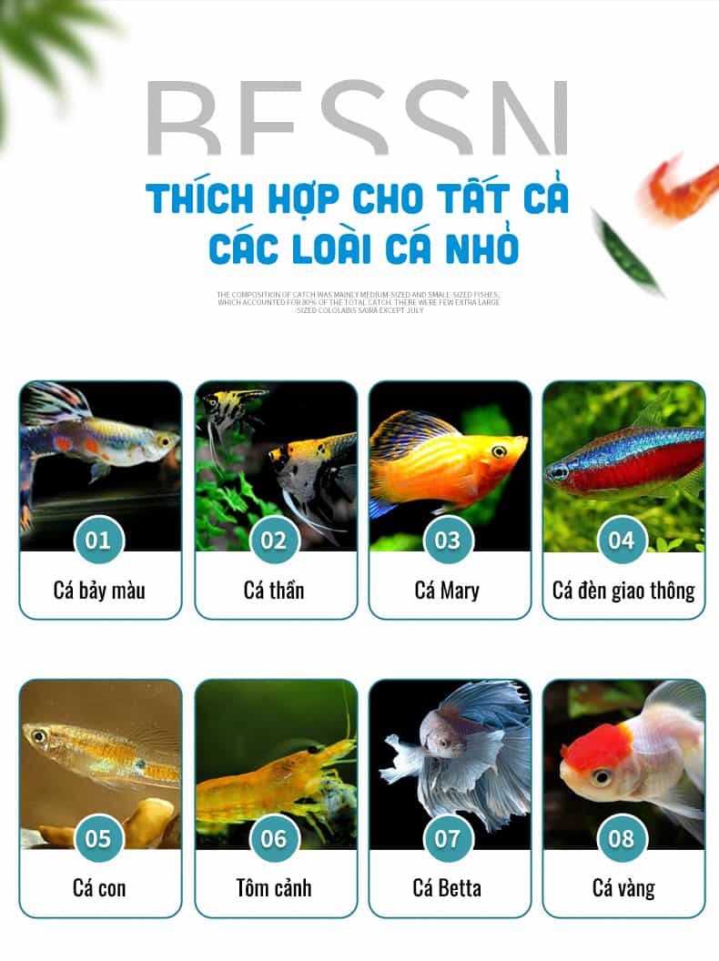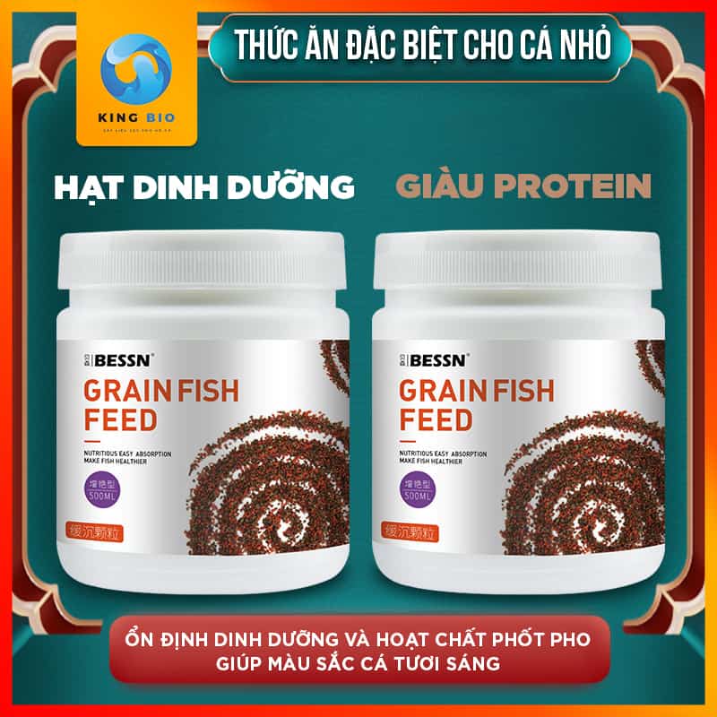 Cám Bessn Grain Fish Feed hạt mịn chuyên dành cho cá nhỏ giúp cân bằng dinh dưỡng, thúc đẩy tăng trưởng, hoạt chất phốt pho làm tăng màu sắc cá tươi sáng, kích thích cá ăn ngon và đặc biệt hạt cám không làm nước bị bẩn, đục. Cám Bessn được sản xuất với nguyên liệu tự nhiên thích hợp cho tất cả loại cá nhỏ: Cá bảy màu, Cá thần, Cá Mary, Cá đèn giao thông, Cá con, Tôm cảnh, Cá Betta, Cá vàng,…