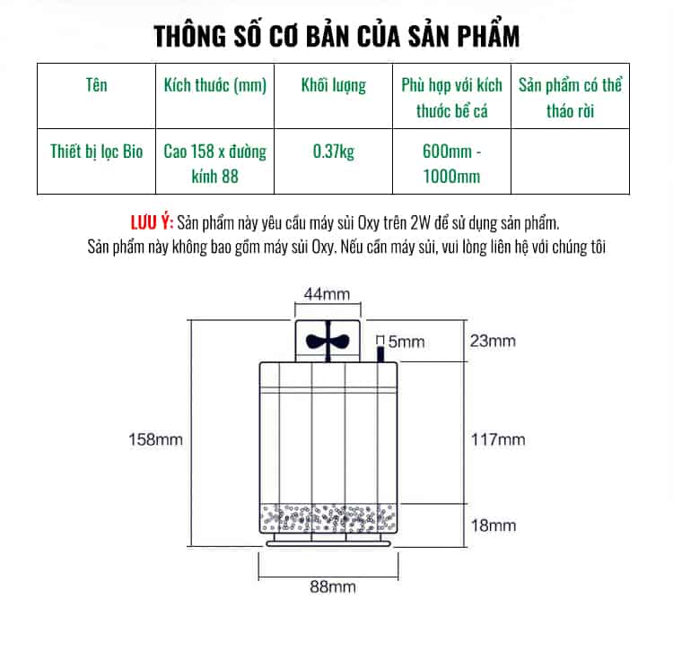 • Thiết bị lọc Bio kiêm sủi oxy có kích thước 9 x 9 x 16cm với phần đáy thiết của thiết bị cách đáy hồ cá là 0,8cm giúp tăng lưu thông dòng nước để tăng hiệu suất hút và giữ lại phân cặn vào trong thiết bị. Phần đầu thiết bị có các lỗ nhỏ giúp lưu thông luồng khí, tăng lượng oxy hòa tan trong nước và làm cho lực hút mạnh hơn