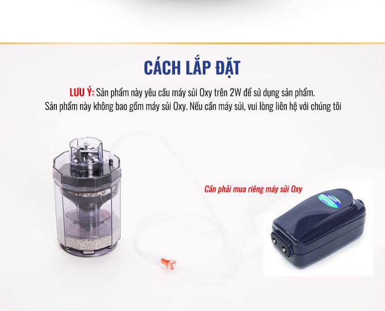 • Thiết bị cần phải được gắn với máy sủi oxy có công suất là 4W. Máy sủi có công suất càng lớn thì lực hút càng mạnh.