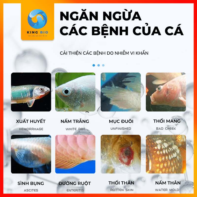 ▸ Loại bỏ các loại bệnh từ vi khuẩn xâm nhập như xuất huyết trong, thối vay, thối đuôi (thường vào mùa hè khi thời gian nóng bức đây là điều kiện lý tưởng để vi khuẩn phát triển gây hại cho cá).