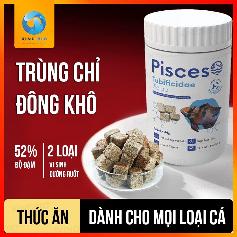 Trùng chỉ đông khô Pisceso Tubificidae (Hộp 500ml khoảng 44g) trùng chỉ đông khô được sản xuất từ nguyên liệu đã qua chọn lọc và tiến hành khử trung bằng tia cực tím, sau đó đông khô chân không trong môi trường vô trùng. Đảm bảo giữ lại đầy đủ các chất dinh dưỡng đồng thời loại bỏ các vi khuẩn gây hại cho cá cảnh có trên trùng.