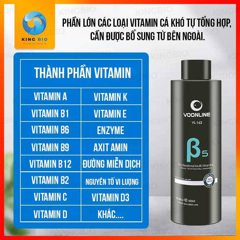 Voonline B5 Professional Multi Vitamins là sản phẩm vitamin tổng hợp với hỗn hợp đa dạng các loại vitamin, axit amin và khoáng chất. Sản phẩm này không chỉ hỗ trợ tiêu hóa mà còn giúp tăng cường sức đề kháng và giảm căng thẳng cho cá cảnh, đảm bảo cá luôn khỏe mạnh và phát triển toàn diện trong môi trường nuôi.